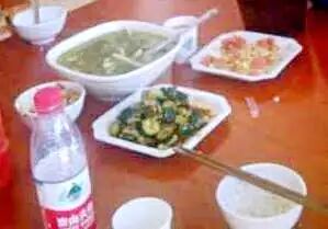 番茄炒蛋,小黃瓜炒肉跟一個看不出什麽的湯?